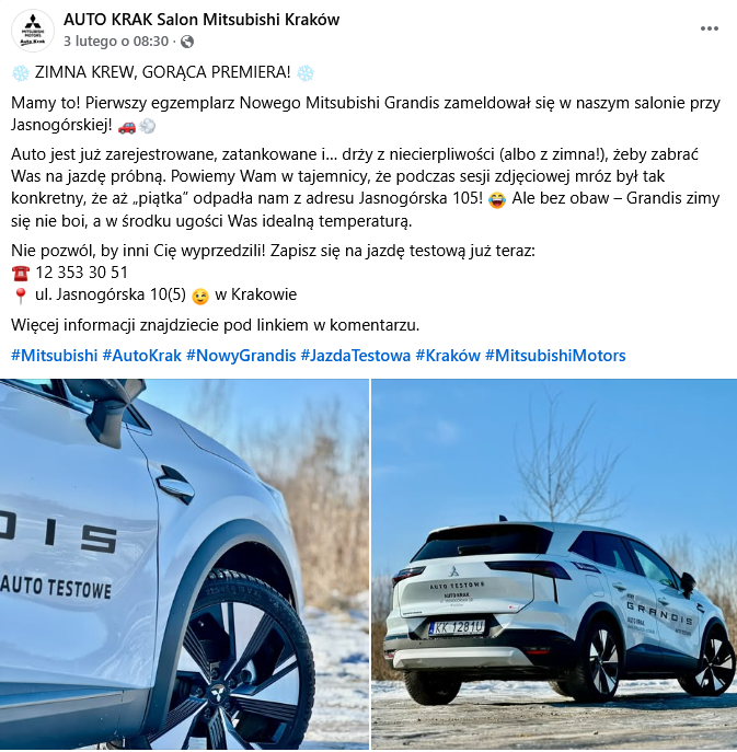 5 lutego, 2026Nie jest tajemnicą, że zima w Małopolsce w ostatnich dniach nie odpuszcza, ale w krakowskich salonach samochodowych atmosfera robi się gorąca. Przy ulicy Jasnogórskiej zameldował się właśnie pierwszy egzemplarz nowego Mitsubishi Grandisa. Samochód, który nazwę dzieli ze słynnym minivanem, powraca w zupełnie nowym wcieleniu, celując w najpopularniejszy segment rodzinnych SUV-ów.